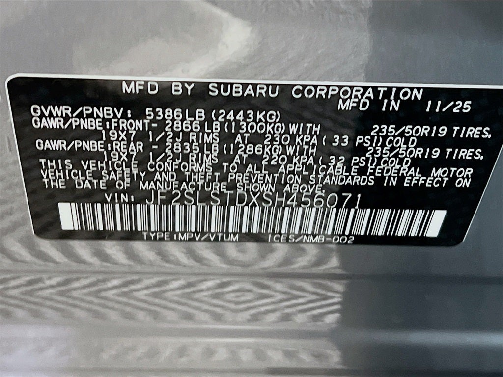 - Wheels: 19" x 7.5 J Dark Gray Aluminum-Alloy -inc: machine finish and black wheel center cap w/Subaru 6 star logo